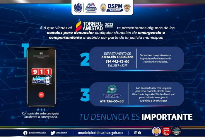 Chihuahua, Chih.- A 16 de octubre de 2023.- El Gobierno Municipal de Chihuahua pone a disposición de visitantes y participantes del Torneo de la Amistad las aplicaciones de seguridad con que cuentan algunas dependencias municipales con el fin de brindar un servicio más completo ante alguna situación de emergencia que pudiera llegar a presentarse durante su estancia en Chihuahua Capital.