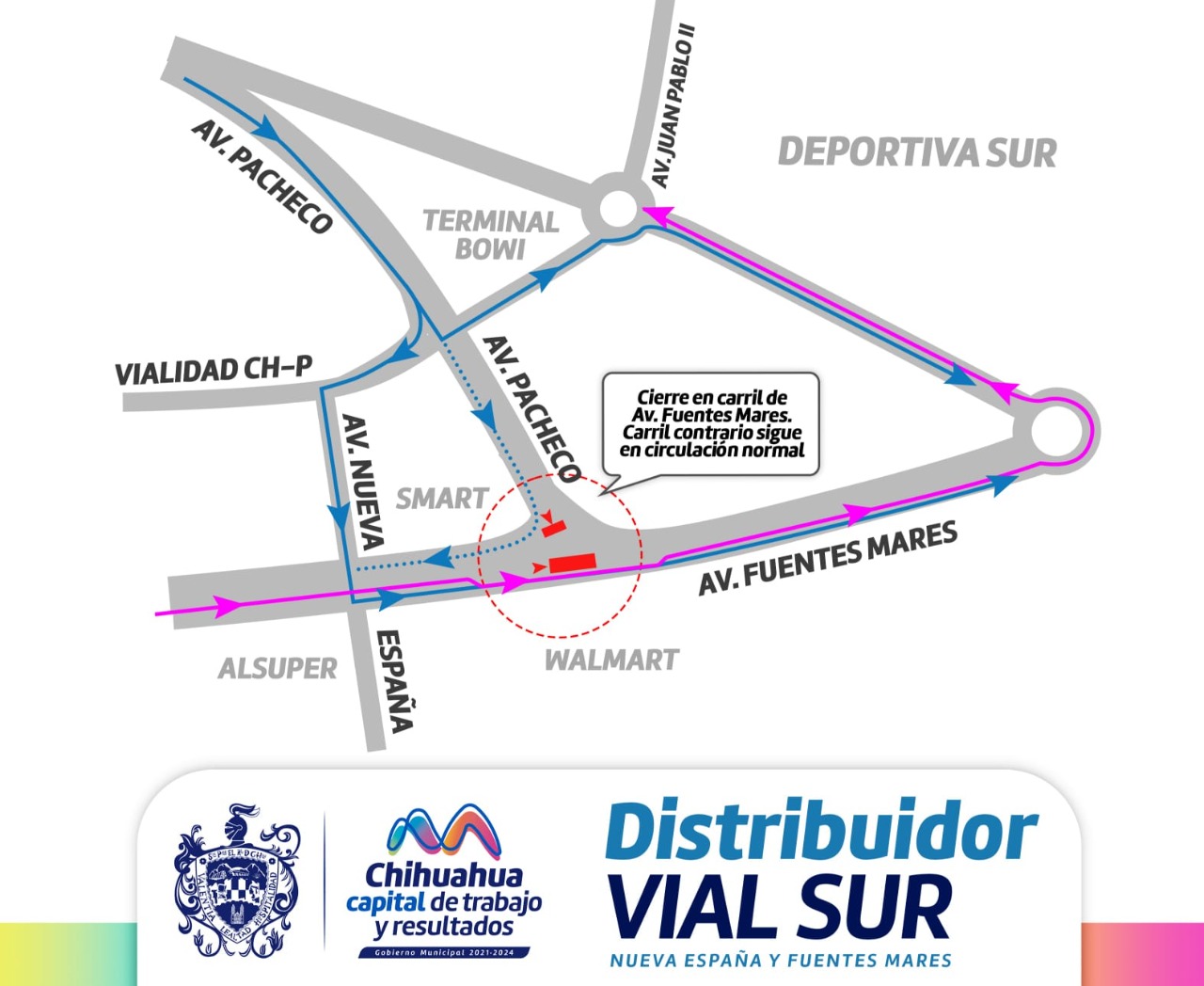 Quienes circulen por la avenida Pacheco rumbo a la avenida Fuentes Mares, con destino al sur de la ciudad, tendrán que desviarse por la vialidad Ch-P tomar la avenida Nueva España y luego la lateral Fuentes Mares. La circulación en sentido de sur a norte no será afectada por el cierre.