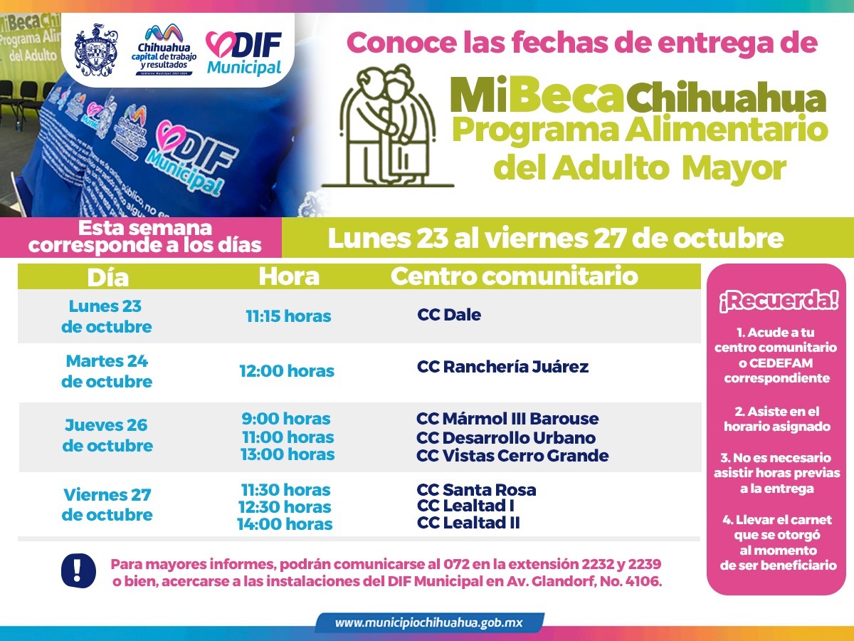 Por FELAChihuahua, Chih.- El DIF Municipal da a conocer que el 23, 24, 26 y 27 de octubre, las y los beneficiarios del Programa Alimentario del Adulto Mayor (PAAM) podrán acudir por su apoyo alimentario a los siguientes centros comunitarios:
