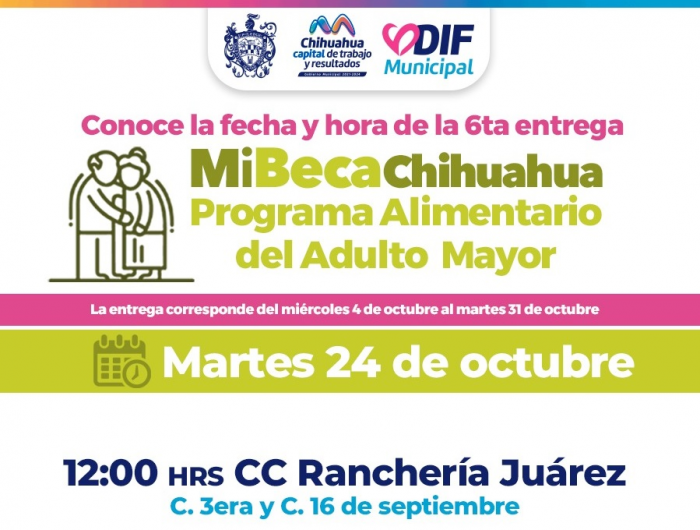 Chihuahua, Chih.- Para el alcalde Marco Bonilla es importante brindar una mejor calidad de vida a las y los adultos mayores de la ciudad, por ello el DIF Municipal, recuerda a las y los beneficiarios del Programa Alimentario del Adulto Mayor (PAAM) que la entrega de su apoyo alimentario será en el centro comunitario Ranchería Juárez, este martes 24 de octubre a partir de las 12:00 horas.