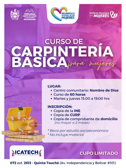 Chihuahua, Chih.- El Gobierno Municipal a través del Instituto Municipal de las Mujeres (IMM) en conjunto con el Instituto de Capacitación para el Trabajo del Estado de Chihuahua (ICATECH), invita a ser parte del curso de Carpintería Básica para mujeres, que iniciará el próximo 31 de octubre.
