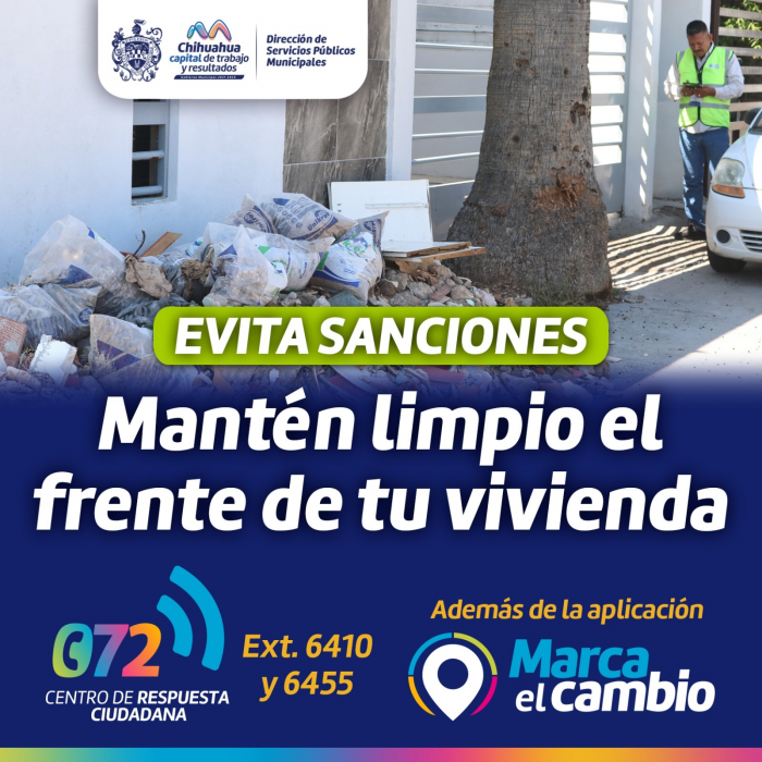 Chihuahua, Chih.- El Gobierno Municipal, a través de la Dirección de Servicios Públicos Municipales, invita a la ciudadanía en general a mejorar la imagen urbana, así como la proliferación de plagas, además de evitar sanciones, al mantener el frente de sus viviendas limpio.Si bien la tarea de limpieza de las calles y avenidas de la ciudad corresponde al Gobierno Municipal, es importante desde cada hogar mantener limpio el frente de los mismos, para mantener una buena imagen urbana.