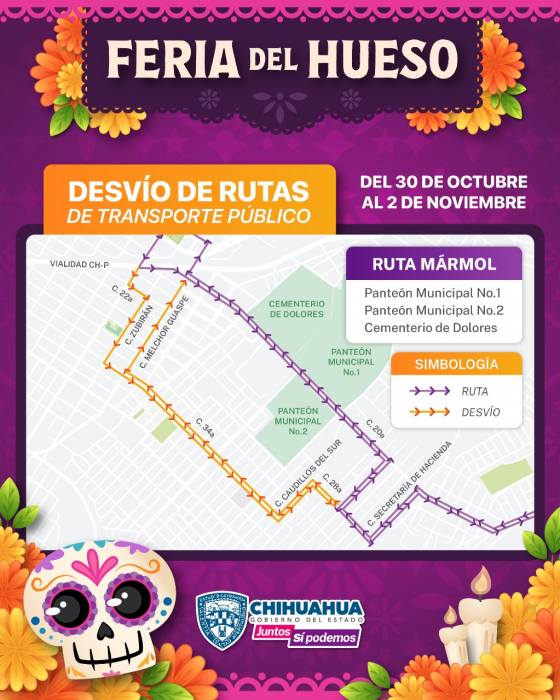 Chihuahua, Chih.- La Subsecretaría de Transporte de Gobierno del Estado, dio a conocer los cambios temporales que se aplicarán del 30 de octubre al jueves 2 de noviembre, en cuatro rutas del sistema de transporte público de pasajeros, que circulan por los principales panteones de la ciudad de ChihuahuaLo anterior, con motivo del gran número de personas que se espera acuda a dichos cementerios, para visitar a los fieles difuntos y participar en la tradicional Feria del Hueso.