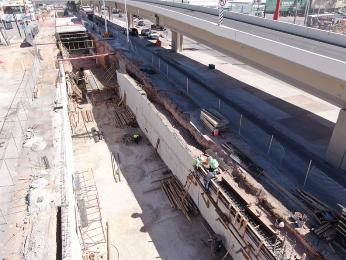 Con una inversión de más de 220 millones de pesos, se construye un paso a desnivel que tendrá una longitud de 450 metros con dos carriles que cruzarán de manera continua por la avenida Nueva España, liberando el cruce de quienes viajan sobre boulevard Fuentes Mares en dirección de sur a norte, además de permitir las vueltas izquierdas en este crucero.