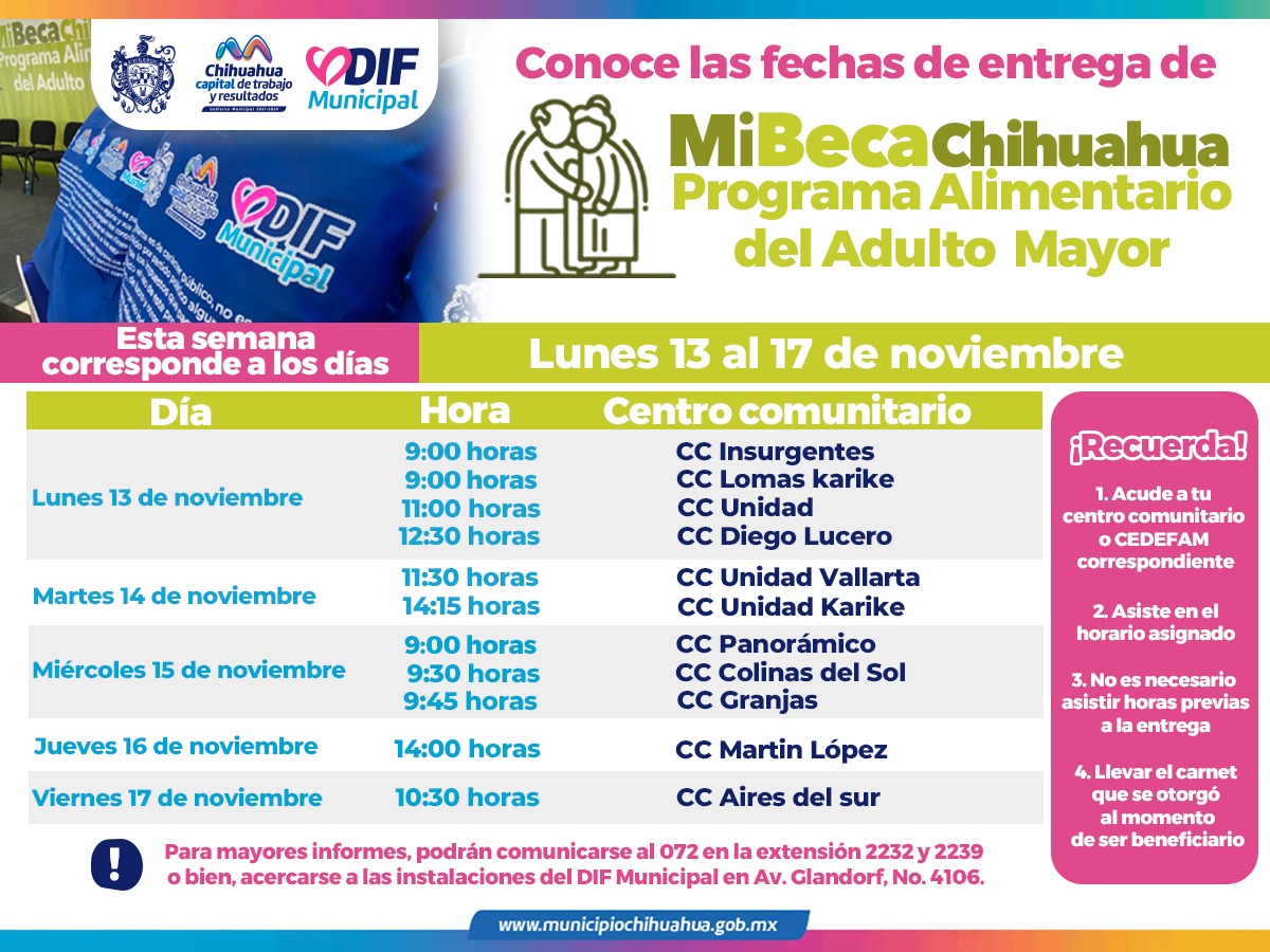 Por FELAChihuahua, Chih.- En atención al compromiso que el alcalde, Marco Bonilla, tiene con las y los adultos mayores de Chihuahua Capital, para garantizarles una mejor calidad de vida, el Gobierno Municipal, a través del DIF, informa que del 13 al 17 de noviembre las y los beneficiarios del Programa Alimentario del Adulto Mayor (PAAM) podrán acudir por su apoyo alimentario a los centros comunitarios: