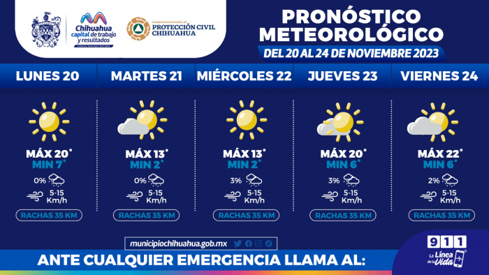 Chihuahua, Chih.- La Coordinación de Protección Civil Municipal informa a la población que para esta semana se pronostican temperaturas mínimas de 2°C, por lo cual se exhorta a atender las recomendaciones por frío, para evitar complicaciones en la salud.De acuerdo al Servicio Meteorológico Nacional de CONAGUA, para este lunes la temperatura máxima será de 20°C, mientras que con una mínima de 7°C, con cielo soleado.