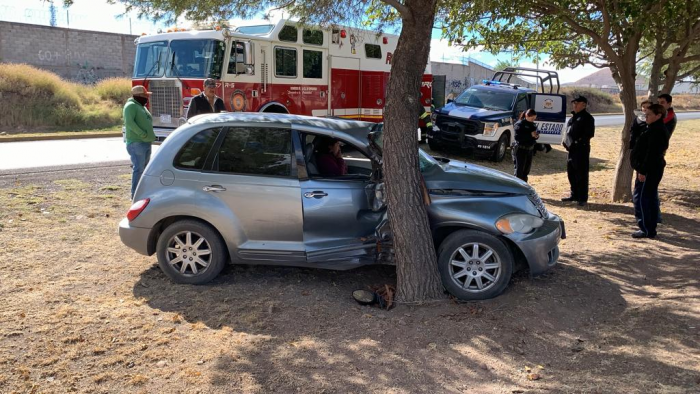 Chihuahua, Chih.- Esta tarde se registró un fuerte choque sobre la vialidad Los Nogales en el sentido oeste a este, donde la conductora de un PT Cruzier, quien al circular a exceso de velocidad, por lo que perdió el control y salió del pavimento.