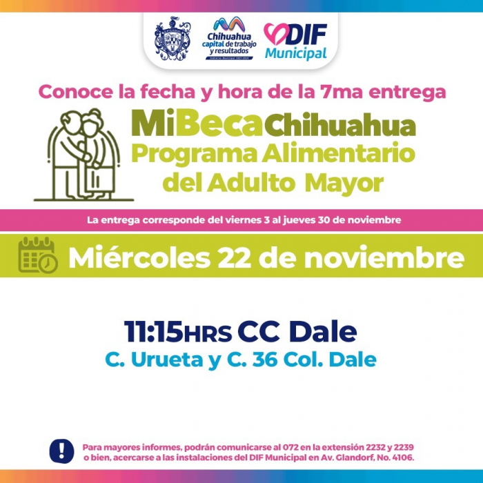 Chihuahua, Chih.- En atención al compromiso que el alcalde, Marco Bonilla, tiene con las y los adultos mayores de Chihuahua Capital para garantizarles una mejor calidad de vida, el Gobierno Municipal, a través del DIF, informa que este miércoles 22 de noviembre las y los beneficiarios del Programa Alimentario del Adulto Mayor (PAAM) podrán acudir por su apoyo alimentario al centro comunitario Dale, a las 11:15 am.Las y los adultos mayores deberán presentarse con el carnet que se les otorgó al convertirse en beneficiarios del programa; asimismo, se les dará preferencia a las personas que señalaron, en su registro, este centro comunitario como lugar para recoger su apoyo alimentario. Es importante que las y los beneficiarios acudan a su centro comunitario, fecha y hora correspondiente.