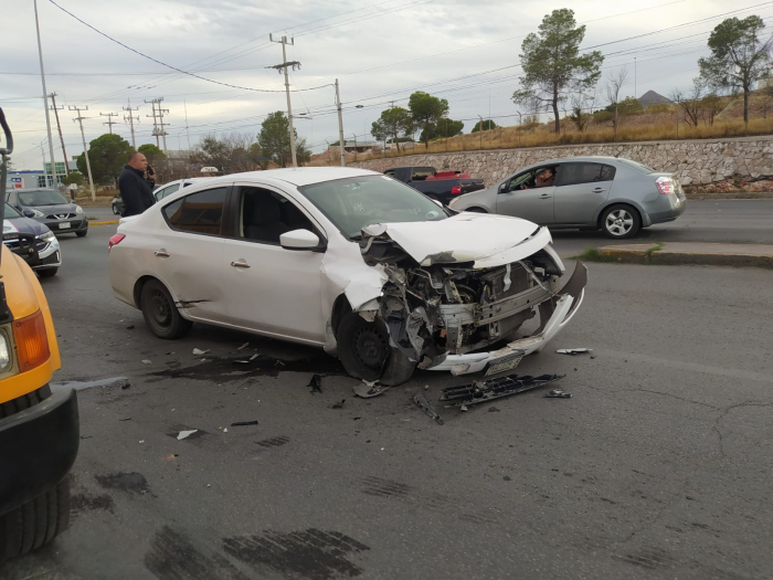 Chihuahua, Chih.- Durante la tarde de este viernes se reportaron 2 choques, uno que dejó una persona lesionada mientras que momentos después ocurrió un aparatoso accidente sucedió en la avenida Pacheco, el cual dejó aparatosos daños y cero personas lesionadasDe acuerdo con el informe preliminar una camioneta Toyota que circulaba de norte a sur por dicha calle principal intenta incorporarse a la calle 17 de junio en la Colonia 2 de octubre sin embargo terminó por cortarle la circulación a un Nissan Versa color blanco.