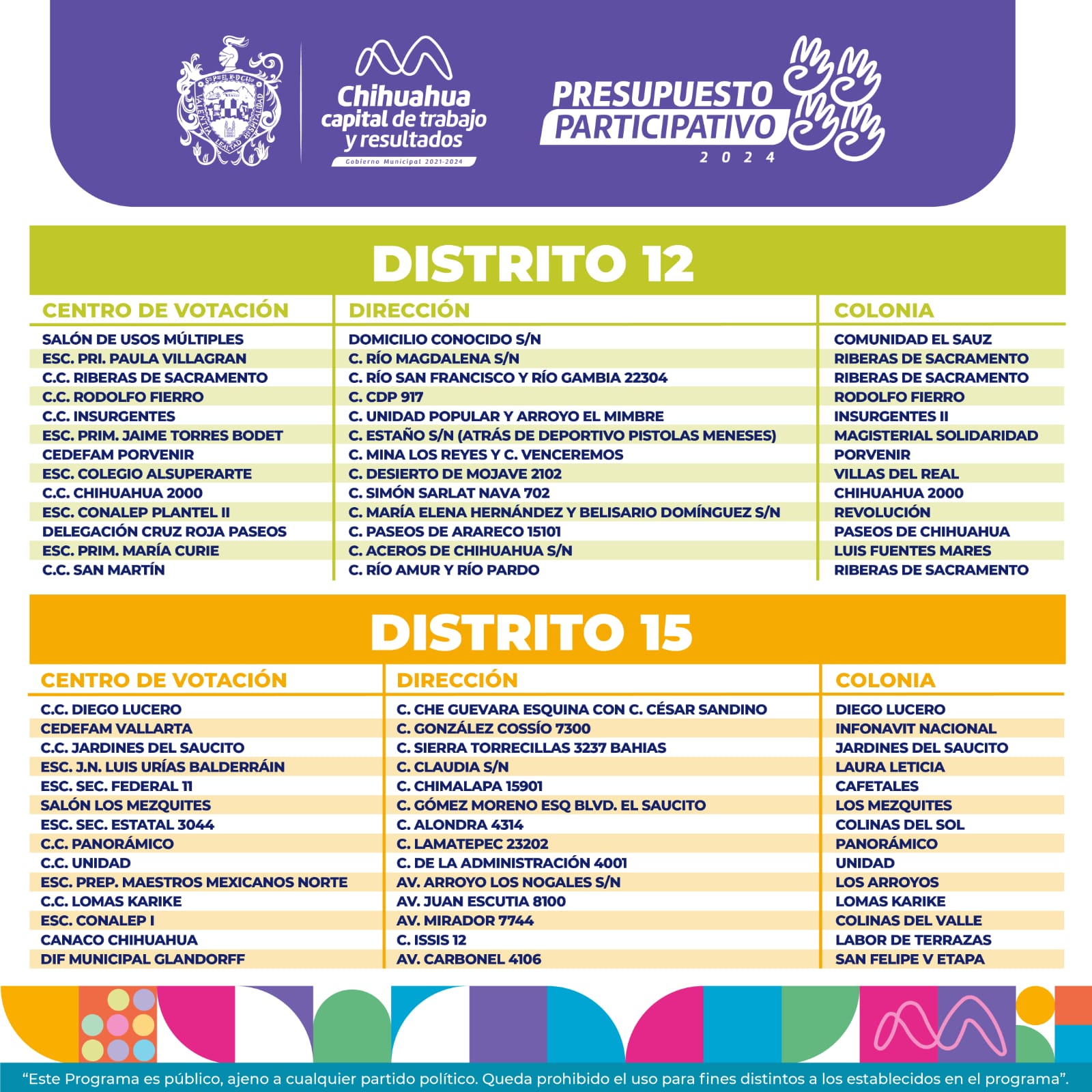 Además, desde las 9:00 de la mañana y hasta las 7:00 de la tarde abrirán sus puertas 73 sedes de votación en distintos puntos de la ciudad de Chihuahua, de los cuales cinco serán centros de votación múltiple (Presidencia, Deportivo Tricentario, Casa de la Juventud, la Dirección de Desarrollo Urbano y Ecología y el CRIT), la ubicación de cada entro la puedes conocer en la página: https://www.municipiochihuahua.gob.mx/CCS/Convocatorias/CONSULTA_AQUÍ_CENTROS_DE_VOTACIÓN_DEL_PRESUPUESTO_PARTICIPATIVO_2024.