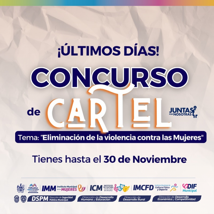 Chihuahua, Chih.- El Gobierno Municipal, a través del Instituto Municipal de las Mujeres y el Instituto de Cultura del Municipio, reitera la invitación a crear un cartel que busque generar consciencia en la lucha contra la violencia de género. Se expandió la convocatoria y tienes hasta el 30 de noviembre para participar.