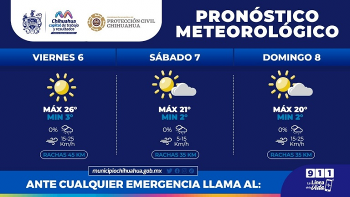 De acuerdo con el pronóstico que emite el Servicio Meteorológico Nacional de CONAGUA, para este viernes se espera una máxima de 26°C y una mínima de 3°C con vientos de hasta 45 kilómetros por hora con un cielo soleado, por otra parte, para el sábado esperamos una máxima de 21°C y mínima de 2°C con vientos de hasta 35 kilómetros por hora y un cielo soleado, para ambos días no se pronostican lluvias.