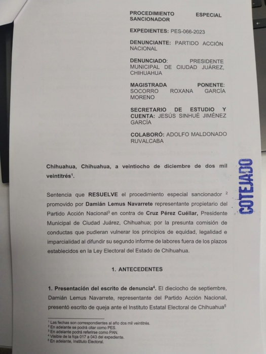 Por FELAChihuahua, Chih.- El Partido Acción Nacional recibió la notificación de la sentencia emitida por el Tribunal Estatal Electoral, en torno a la denuncia interpuesta por el ilegal informe de labores que presentó el presidente municipal de Ciudad Juárez.