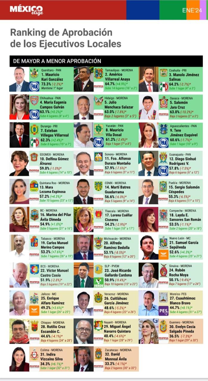 De acuerdo con la información publicada por la casa encuestadora, Maru Campos subió cuatro posiciones en el ranking apenas iniciado el 2024, al pasar del 8º al 4º sitio, para ubicarse así en el Top 5 de los mandatarios estatales con mayor aceptación.