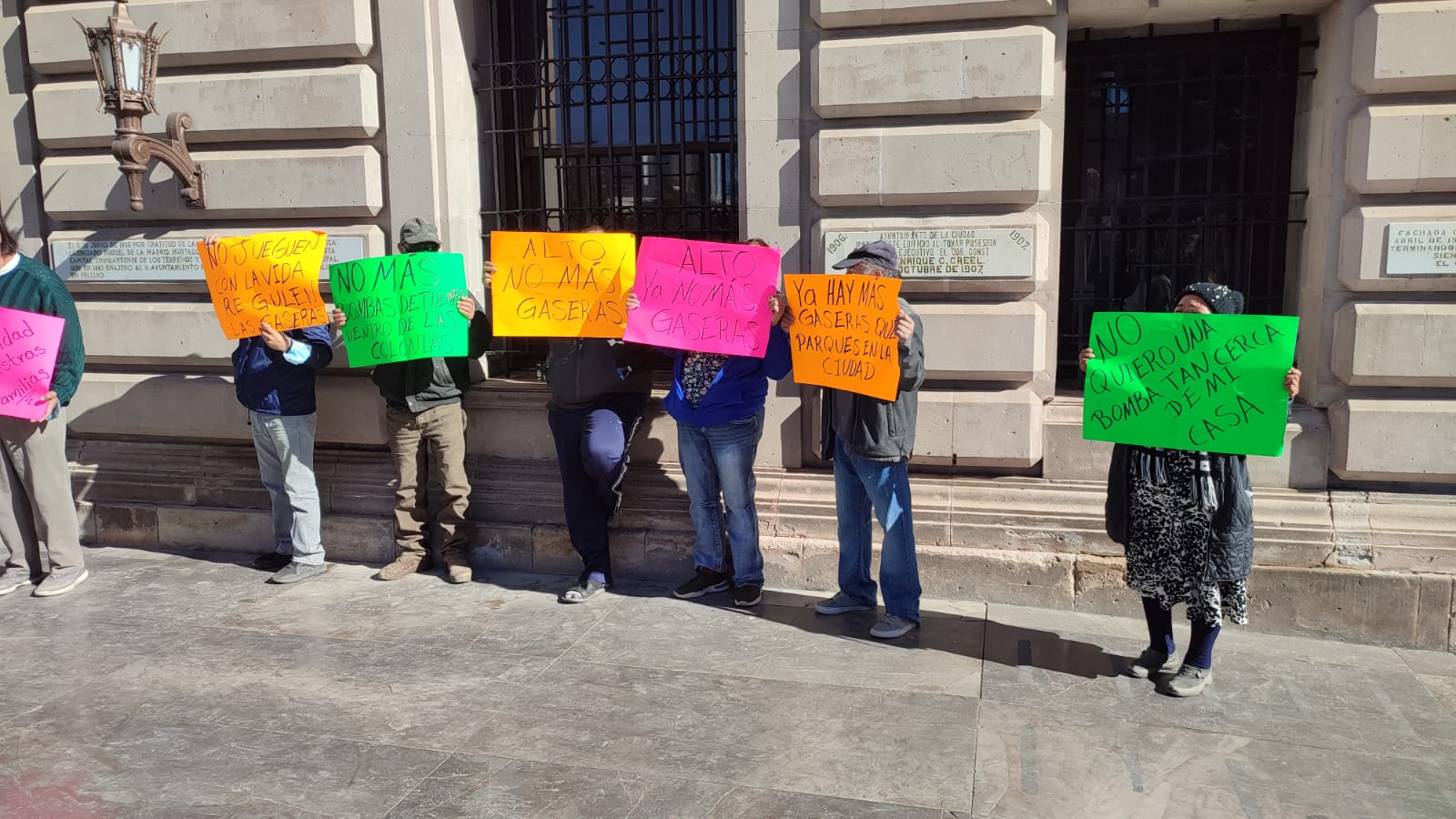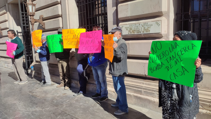 Chihuahua, Chih.- Ciudadanos de la colonia El Árbol y Ladrilleras Sur, se manifestaron en frente de la Presidencia Municipal para pedir al alcalde Marco Bonilla se revise la situación de dos gaseras ya que señalan operación pone en riesgo a los habitantes.