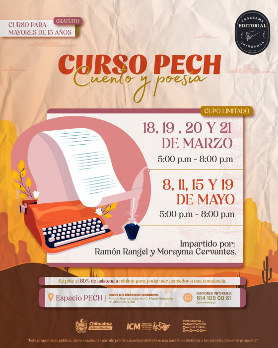 Chihuahua, Chih.- El Gobierno Municipal, a través del Instituto de Cultura del Municipio, invita a participar en el “Curso de Cuento y Poesía”, dirigido a mayores de 15 años que deseen explorar y desarrollar su creatividad literaria.
