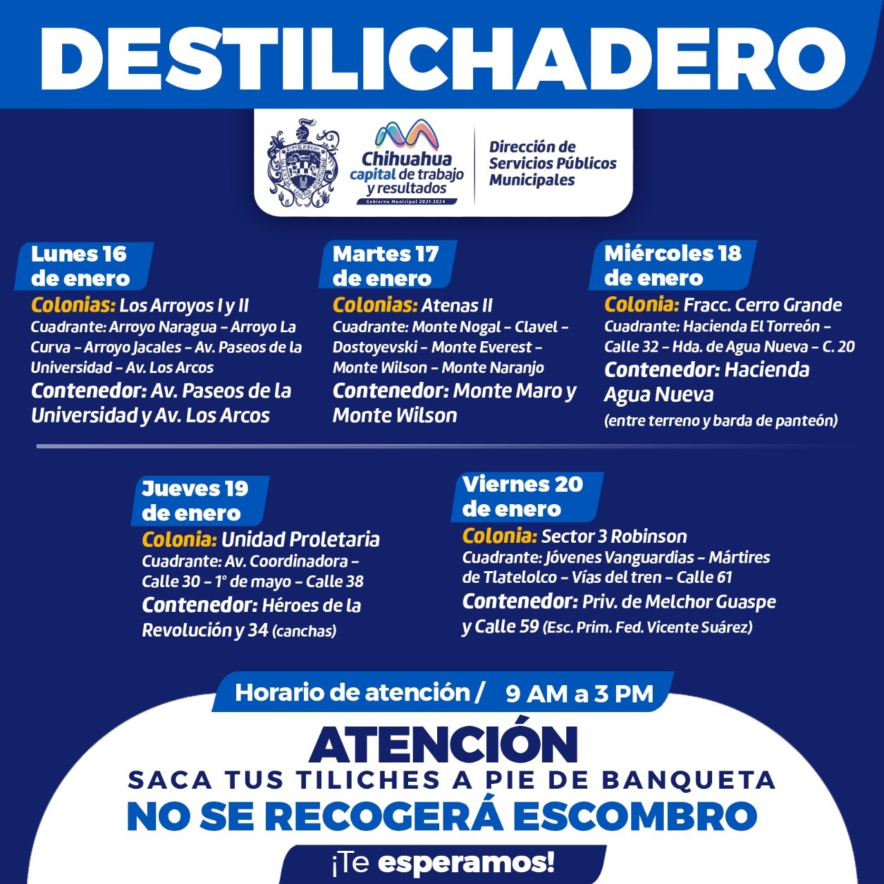 Por RedacciónChihauhua, Chih.- El Gobierno Municipal, a través de la Dirección de Servicios Públicos Municipales, informa a la ciudadanía el calendario del programa Destilichadero que se realizará del 16 al 20 de enero, en seis colonias de Chihuahua Capital.