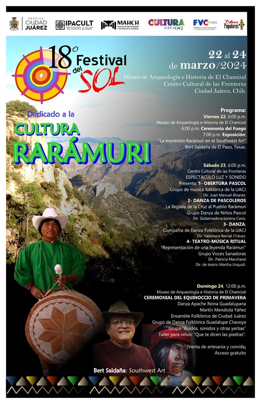 Para el arranque de este evento se realizará la tradicional ceremonia del fuego a las 6:00 de la tarde, para proceder a la inauguración de la exposición “La expresión Rarámuri en el Southwest”, de Bert Saldaña.